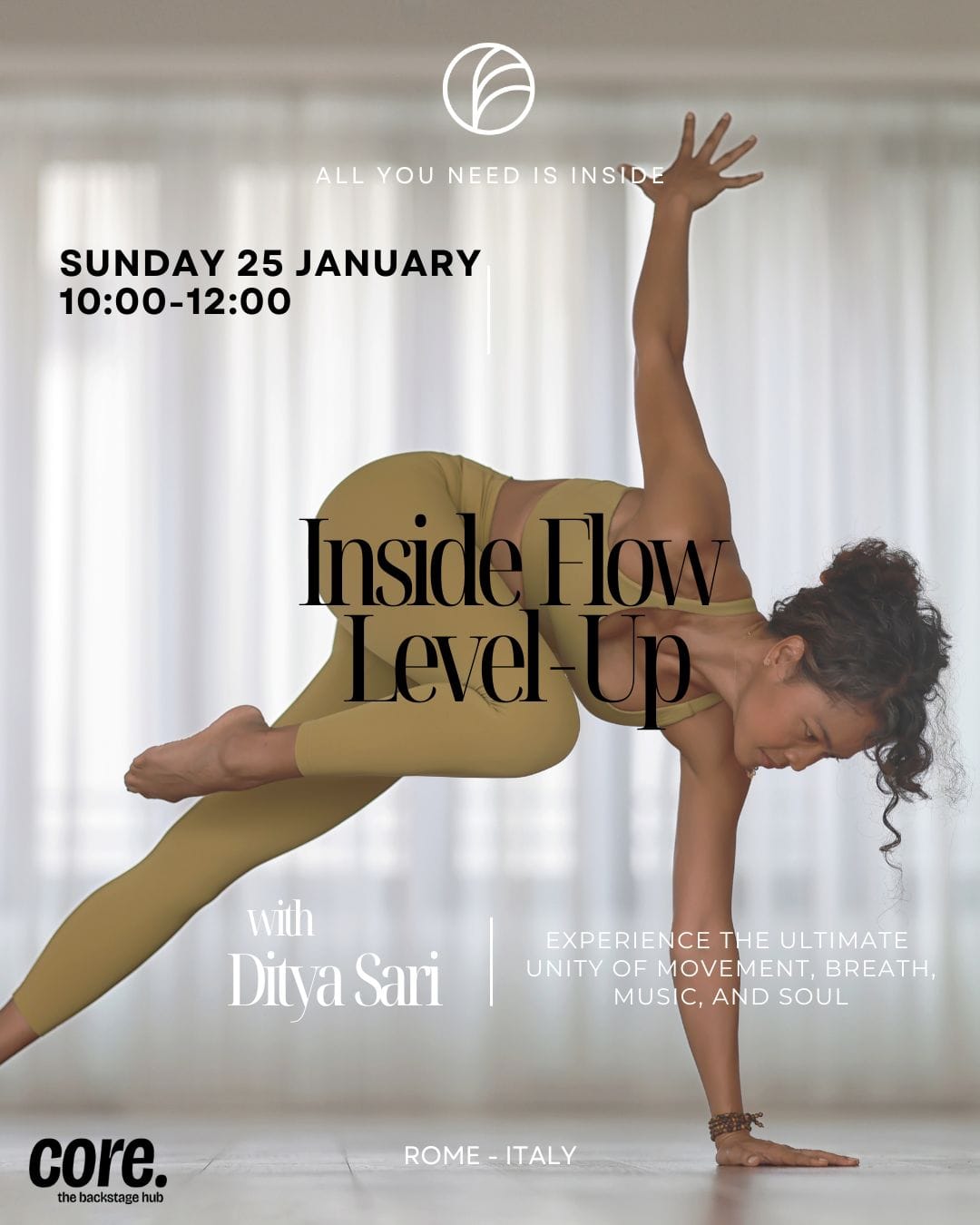 La mia prima lezione Di Inside Flow con Ditya, ho faticato tanto, e mi sono divertita tantissimo. La lezione guidata da lei ti fa sentire in armonia con te stessa, il tuo respiro, e il tuo corpo! Ho apprezzato molto il tuo comunicare con dolcezza e con professionalita, la tua bravura ed eleganza nel muoverti e il tuo sorriso. Grazie Ditya!